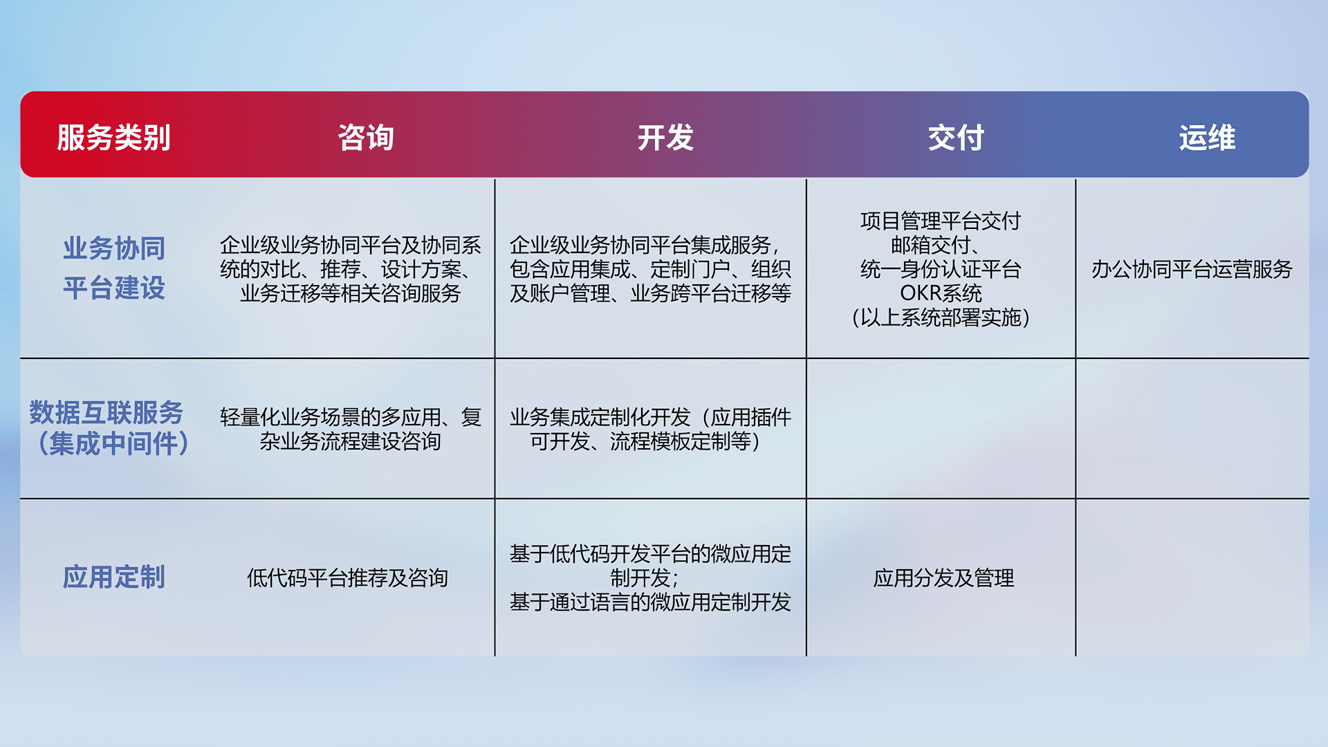 针对钉钉、、、、企微、、、IDaas等平台级产品提供产品的规划、、、、方案、、、、交付、、、定制化开发等服务,,,实现如统一协同办公、、、智能客户服务、、混合会议管理、、、智能数据查询、、等业务场景,,,实现数字化转型。。